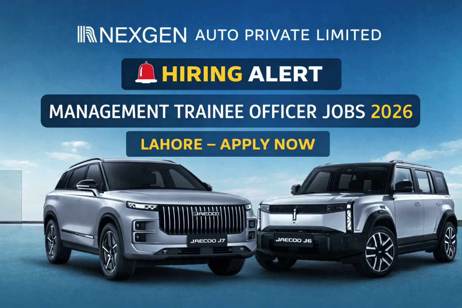 Auto Industry CareersAutomotive Industry Jobs PakistanCorporate Jobs PakistanEntry Level Jobs PakistanFresh Graduate Jobs LahoreGraduate Jobs 2026Hiring Alert PakistanLahore Jobs 2026Latest Jobs in LahoreManagement Trainee Officer Jobs 2026Management Trainee Program PakistanMTO Jobs in LahoreNEV Industry JobsNexGen Auto Jobs 2026NexGen Auto Private LimitedOMODA JAECOO PakistanPakistan Private Sector JobsPrivate Jobs in Lahore 2026Sales Admin Jobs 2026Sales Admin MTO