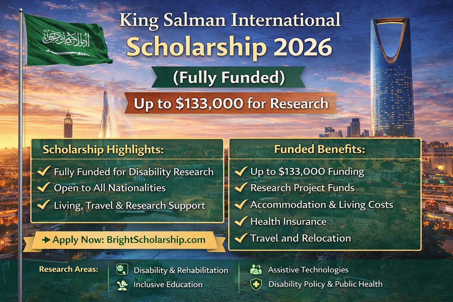 The King Salman International Scholarship 2026 (Fully Funded) is a prestigious global research scholarship offered by the Government of Saudi Arabia. This program is designed to support advanced disability-related research and promote inclusive…