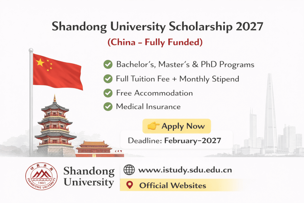 The Shandong University Scholarship 2027 in China (Fully Funded) is now open for international students who wish to pursue Bachelor’s, Master’s, and PhD degrees at one of China’s most prestigious and globally recognized universities. This scholarship provides an excellent opportunity to study in China with full financial support, including tuition fees, monthly living allowance, accommodation, and medical insurance.