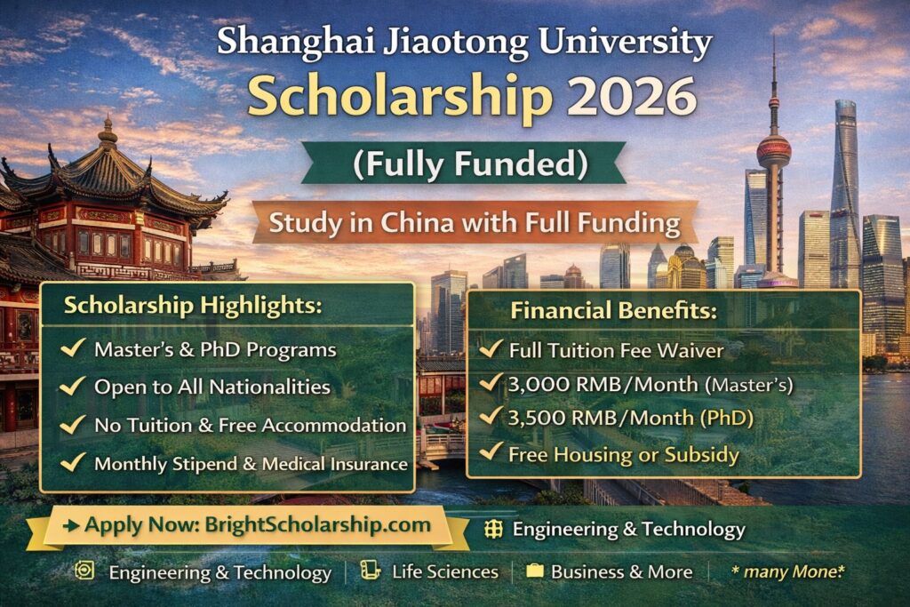 The Shanghai Jiaotong University Scholarship 2026 in China (Fully Funded) offers an exceptional opportunity for international students to study at one of Asia’s leading universities with full financial support. With comprehensive funding, diverse academic programs, and a globally recognized degree, this scholarship is an excellent choice for students seeking high-quality education in China.